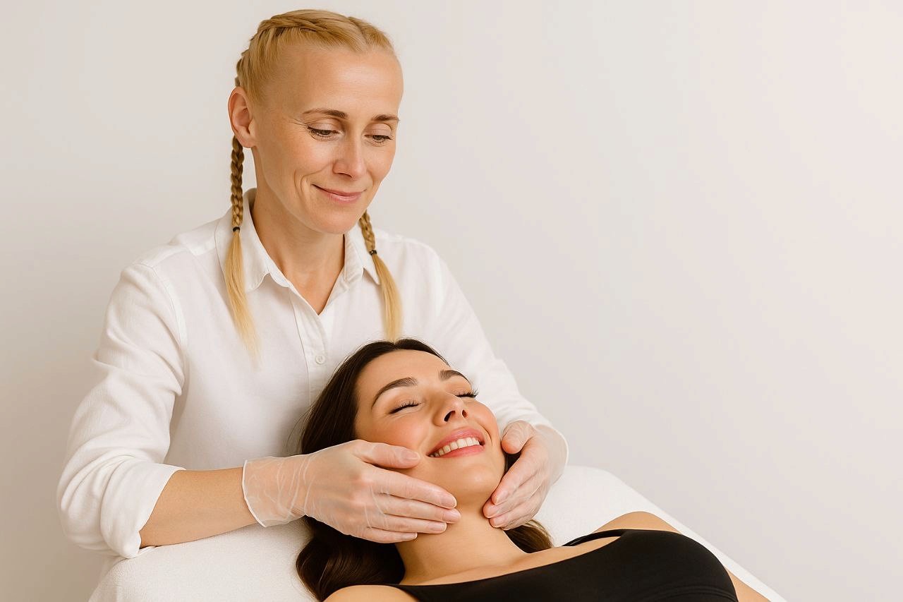 To address specific facial concerns, services such as Restoration of Sunken Cheeks lift and restore volume, and Manual Correction of the Orbital Zone reduces puffiness and fine lines around the eyes. Our Myofascial Massage focuses on releasing tension in connective tissue, while Facial Reflexology and Sculp Defibrosing Massage stimulate circulation and improve skin tone. The Intraoral Massage provides relief for jaw pain and tension, particularly beneficial for TMJ disorders. For upper body relaxation, the Head, Neck, Arms, and Décolleté Massages relieve tension and stiffness, promoting a sense of calm and rejuvenation.