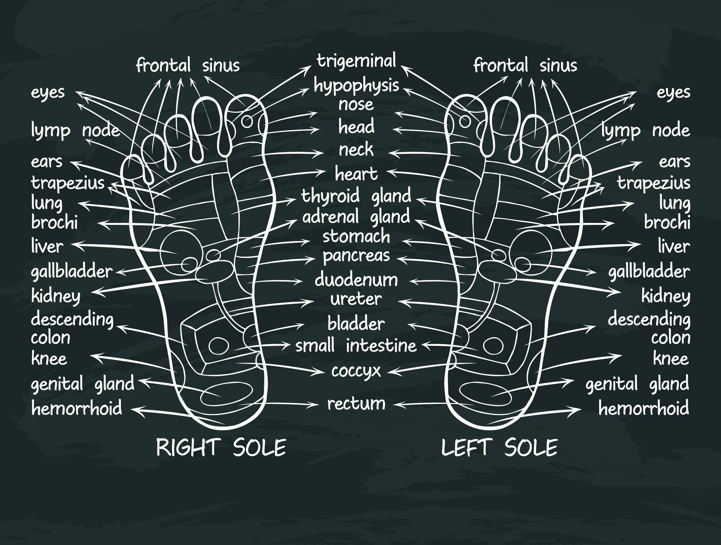 The feet can be seen as a map of the body. All major organs, systems, and anatomical areas have corresponding reflex zones on the feet. A typical session often addresses specific areas of tension held within the body, as well as broader issues through the use of zone therapy. In zone therapy, the foot is divided into five reflex “zones” or strips that run symmetrically from the base of the heel to the top of each toe. By working on each zone, you influence the corresponding side of the body.